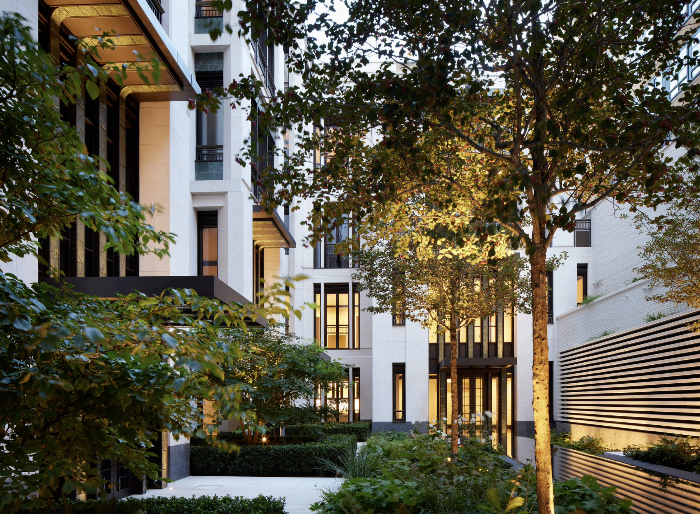 retail. The building rises from this central shared garden, a rarity in Mayfair, with private balconies and stepped terraces on each level and is inspired by a context that is rich in heritage but also re-establishing itself as a contemporary arts and cultural district. The massing has been carefully sculpted to provide a smooth transition of scale from surrounding buildings, key to this is the new planting, public art, and extended pavements at street level which have been installed to comfortably integrate the development into the surrounding public realm.
